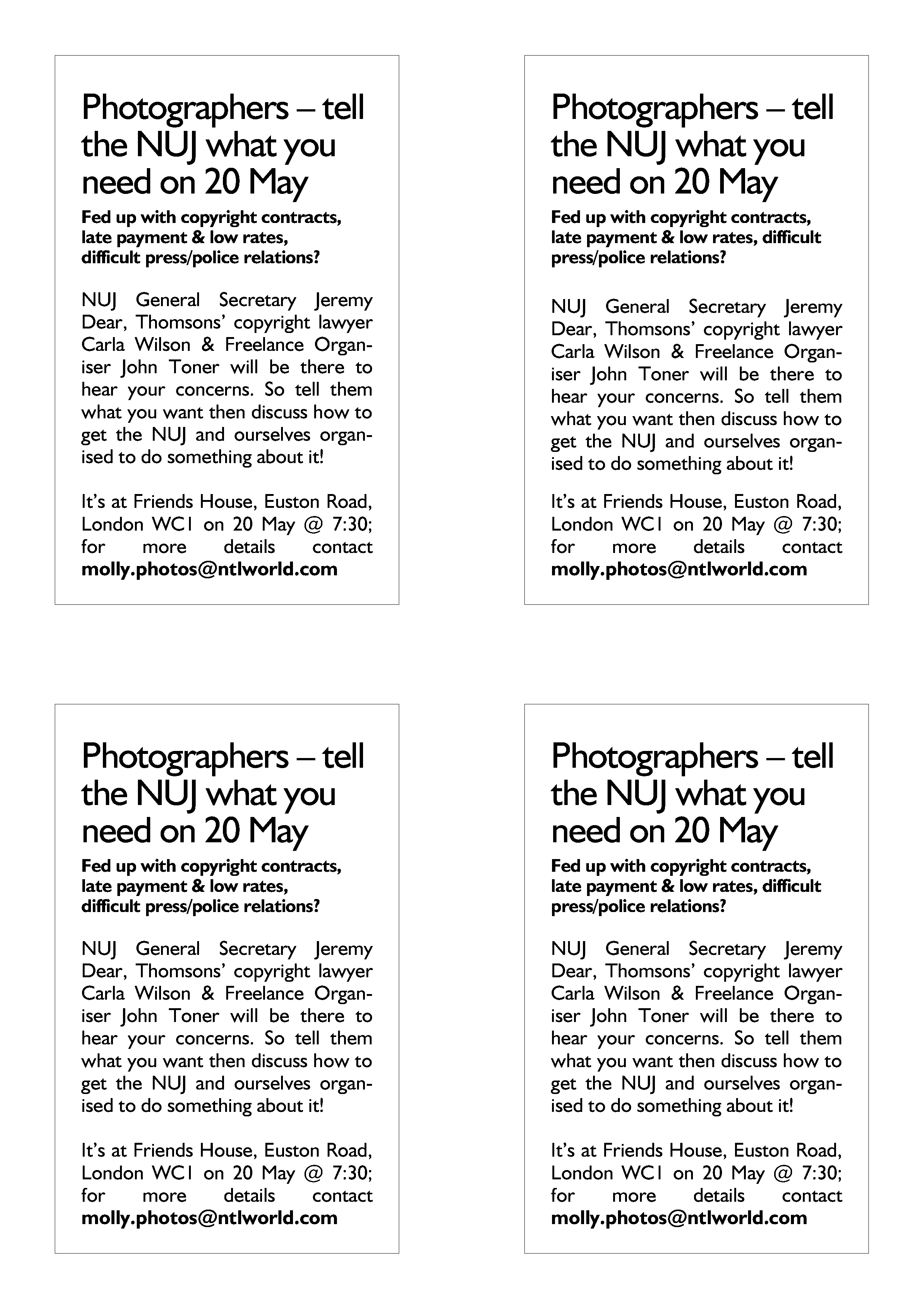 talk about this. General Secretary Jeremy Dear, Thomsons copyright lawyer Carla Wilson and Freelance Organiser John Toner will be there to hear your concerns. So tell them what you want then discuss how to get the NUJ and ourselves organised to do something about it!